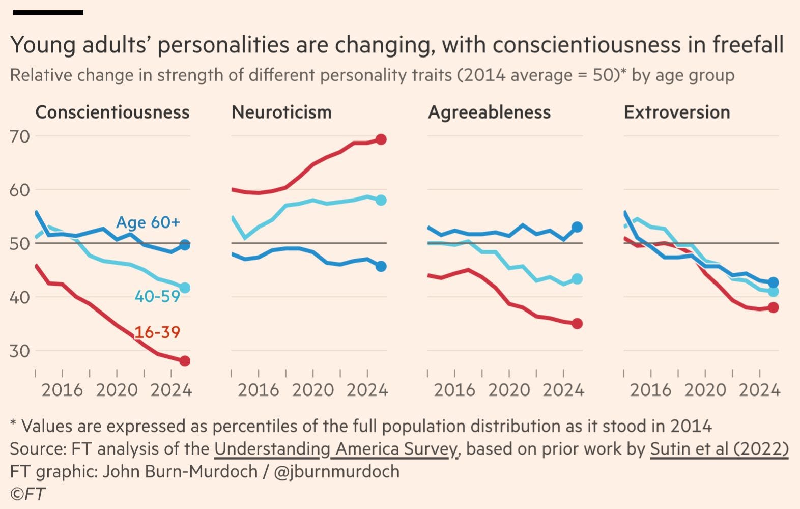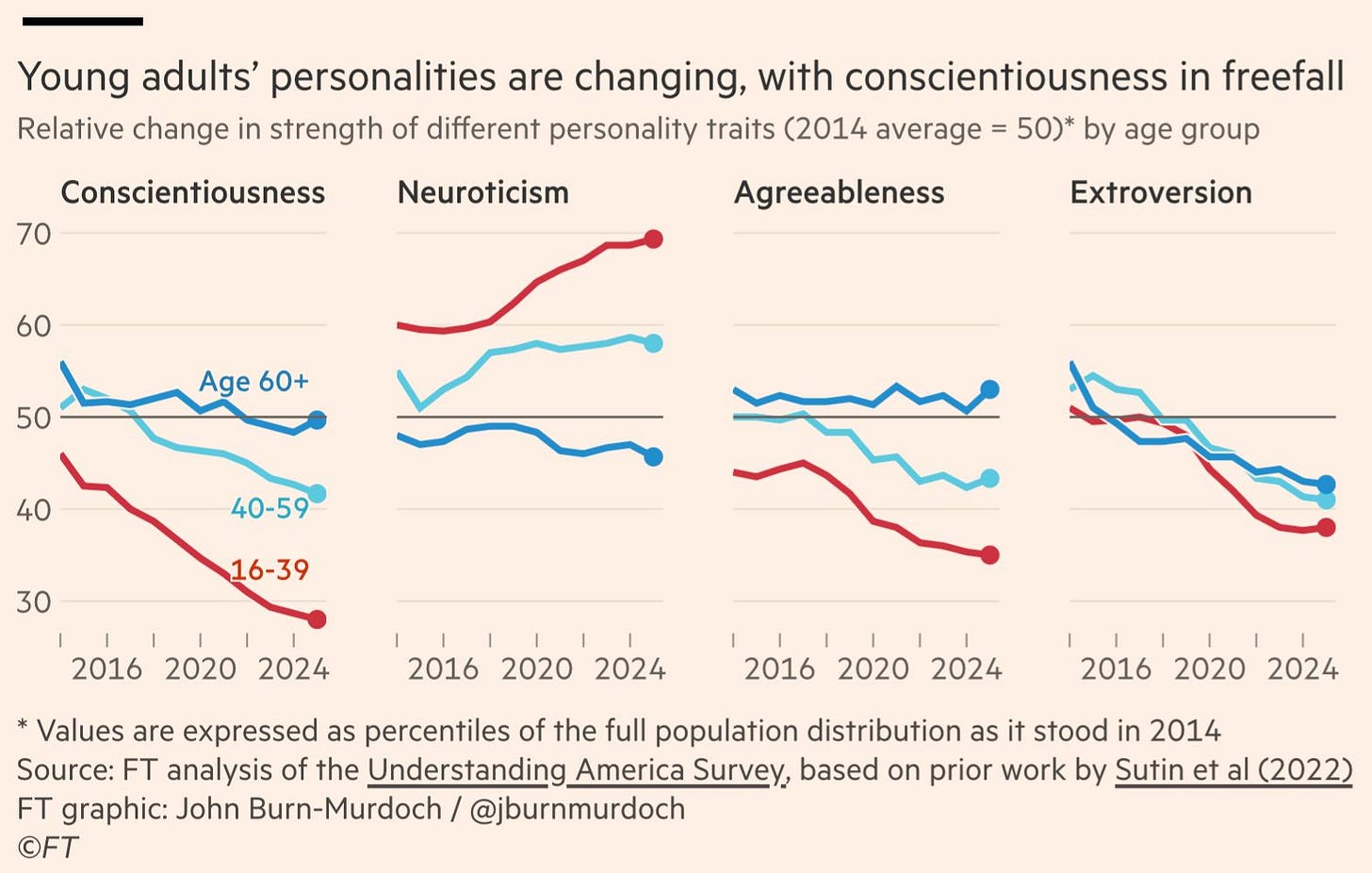 It draws on a lot of solid research to paint an alarming picture of how radically young peoples personalities have are changing in recent years. You can check out the key takeaways in his X thread here or check out his full story if you have a sub here.