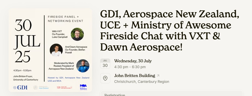 GD1, Aerospace New Zealand, UCE + Ministry of Awesome Fireside Chat with VXT & Dawn Aerospace: Absolute powerhouse lineup on an event happening down in Christchurch for all those Caffeinators who can’t make our Auckland event happening the same night, I would encourage you to head along to this one.