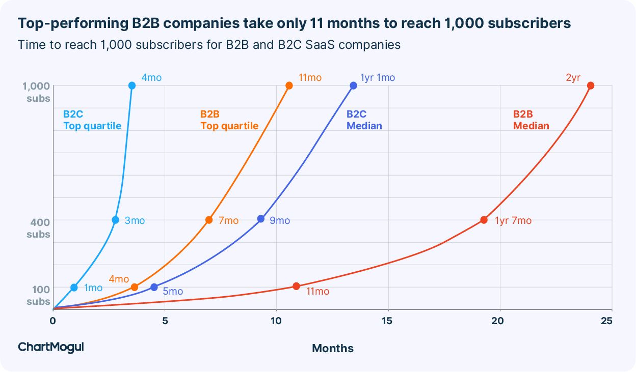 Top-performing B2B companies reach 1,000 subscribers in just 11 months, while the median B2B company takes 2 years.