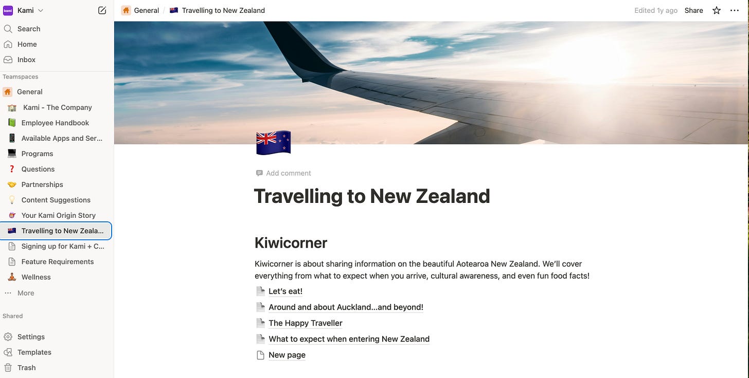 Walk through Kami’s workspace and the logic clicks right away. Locked pages hold the must-haves: HR policies, contract templates, regional compliance docs. Unlocked pages are fair game for anyone to extend: the living founding story, a glossary of acronyms, a gallery titled “Doggos of Kami” that gets new photos every fortnight. You know, the essentials.