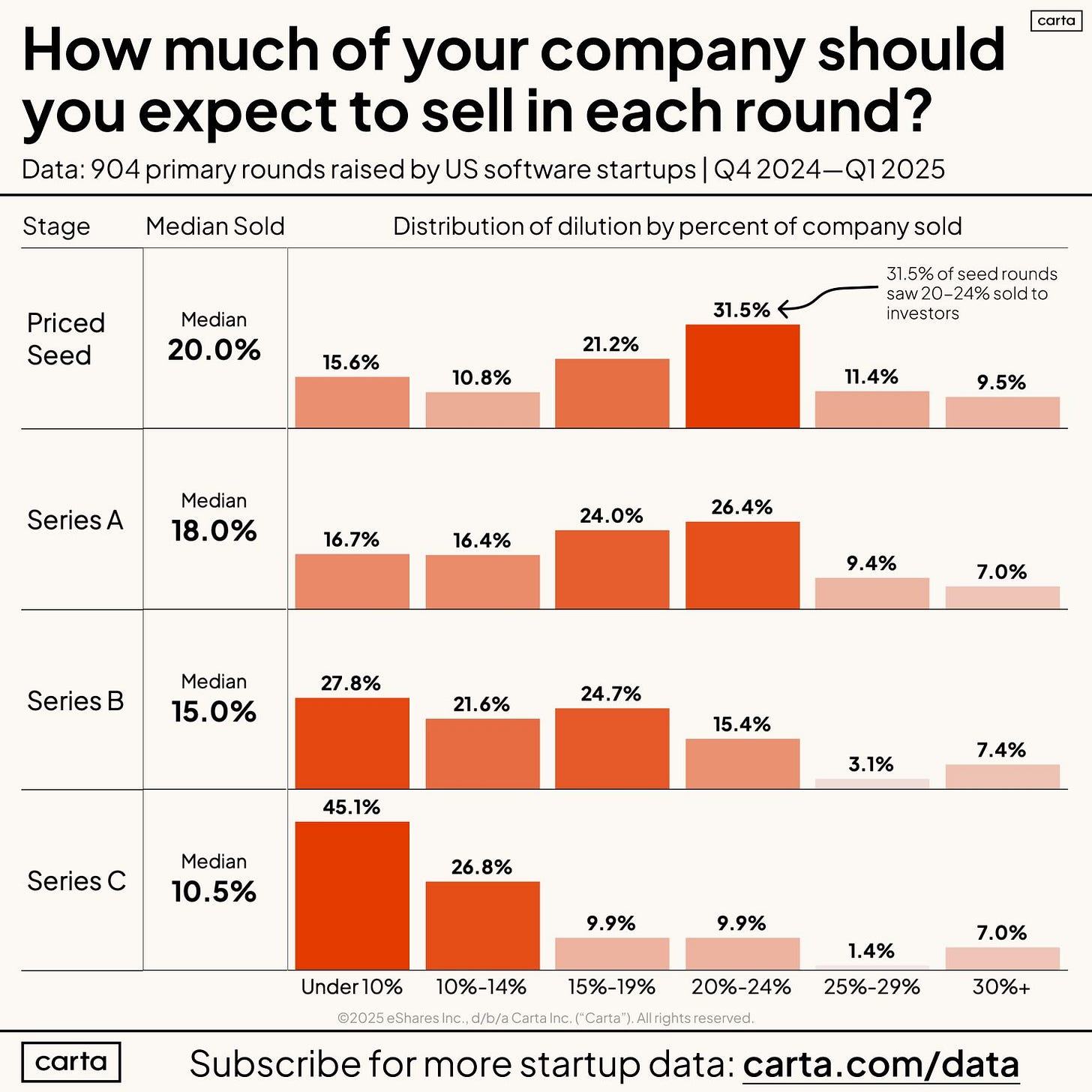 How much of your company should be expected to sell at each round? : Great resource here from Peter Walker, Head of Insights over at Carta in the U.S, breaking down in an easily digestible graphic exactly how much of your startup you can expect to be selling with each round.